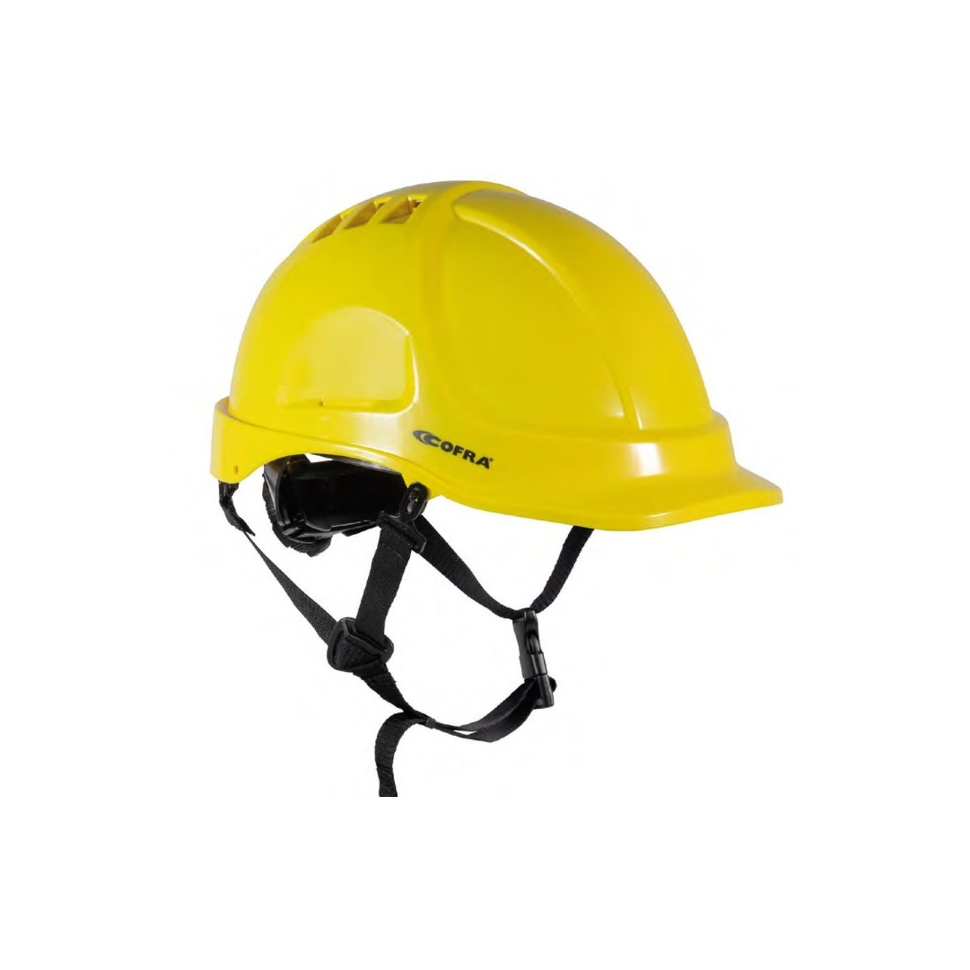 Cofra Litess Vent helmet: lightweight, ventilated, and fully adjustable, with 6-point harness and Euroslot for PPE integration. Complies with EN 397:2012+A1:2012.