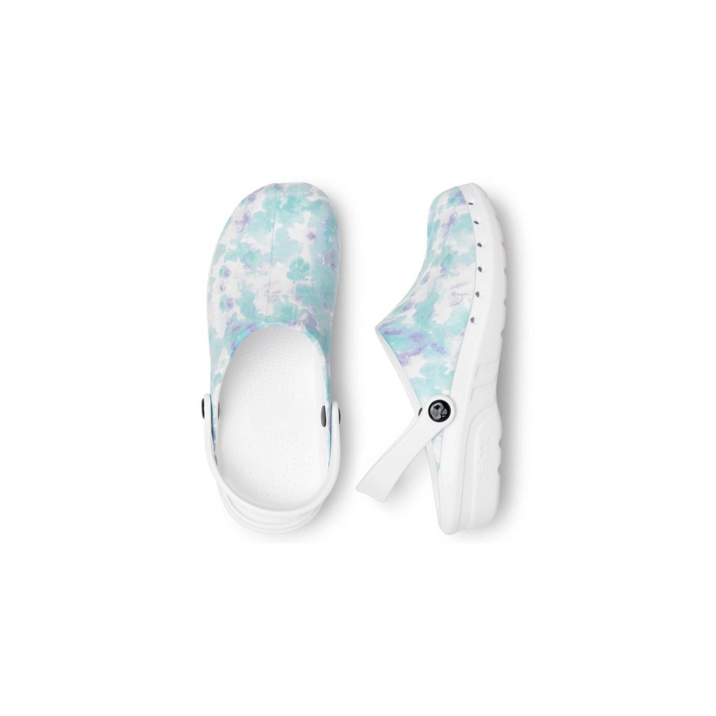 The ODEN Water Flower printed healthcare clogs by Suecos offer comfort, safety, and style thanks to their ergonomic design, anti-slip sole, antimicrobial and waterproof material, and optimal ventilation. They are lightweight, flexible, and sterilizable, perfect for long work shifts.