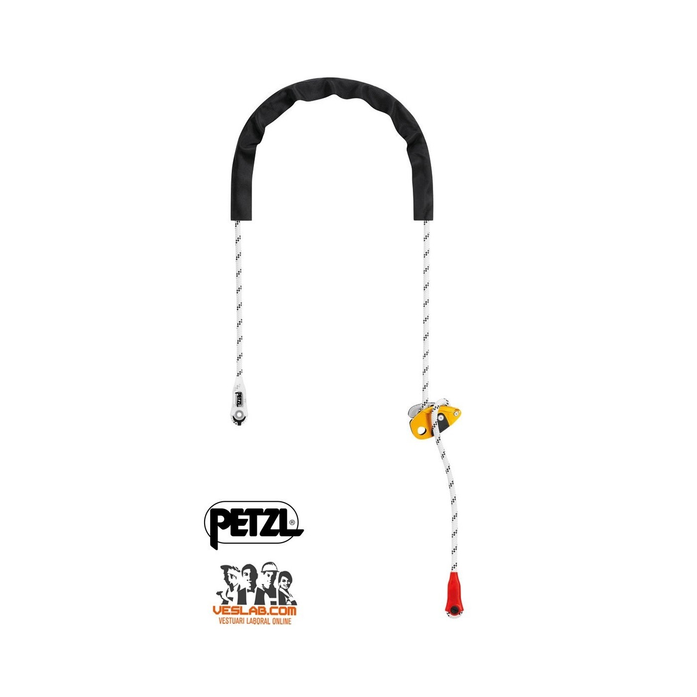 - single mode, on the harness ventral attachment point, when the anchor is located above the user, so that the load is comfortably distributed between the belt and leg loops. Length is adjusted by operating the handle, while holding the free end of the lanyard - Sewn terminations on both ends with plastic sheath to keep the connector in position and protect the rope from abrasion