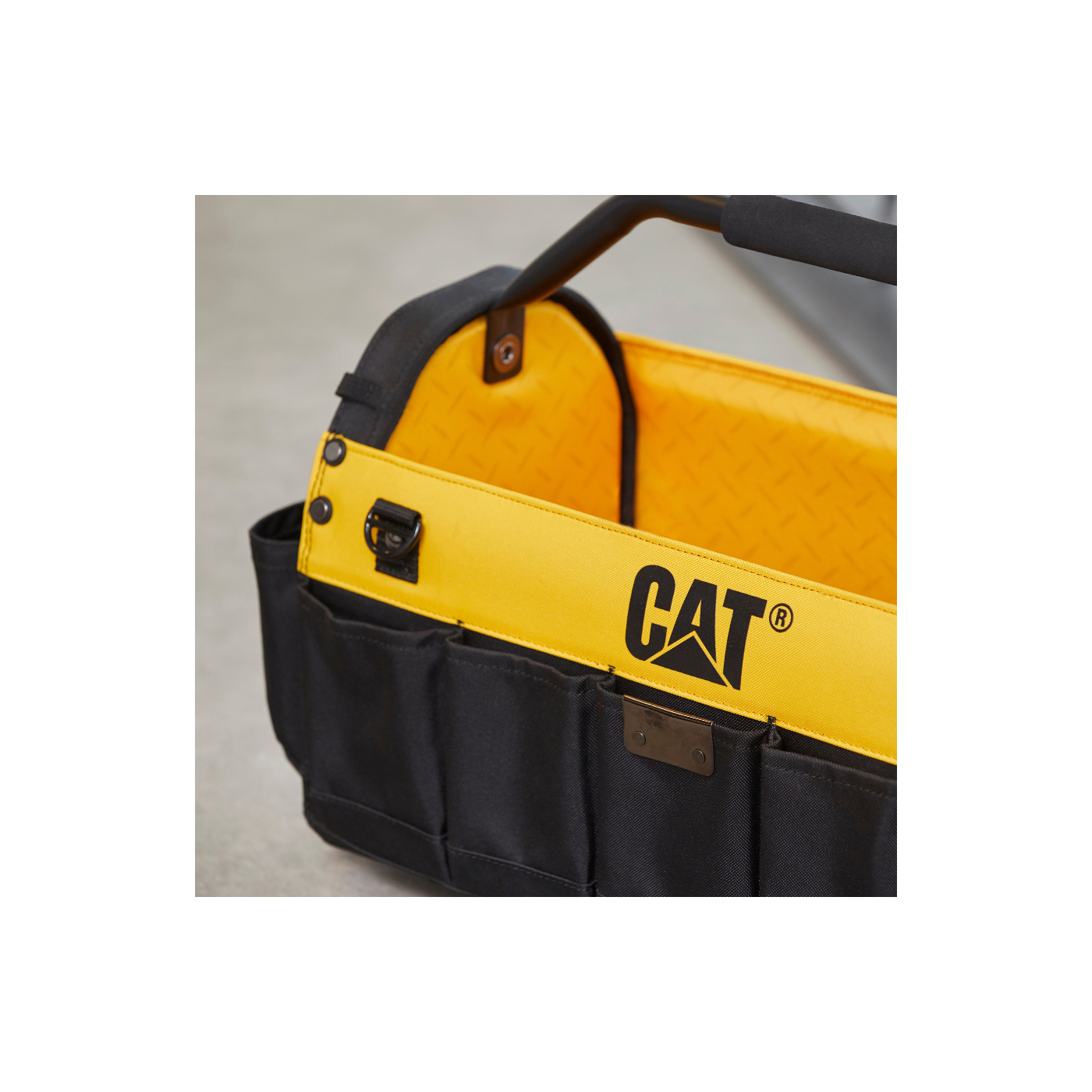 CAT GP-65046 open tool bag with 33 compartments, 26L capacity, and a durable metal frame. Built for intensive professional use.