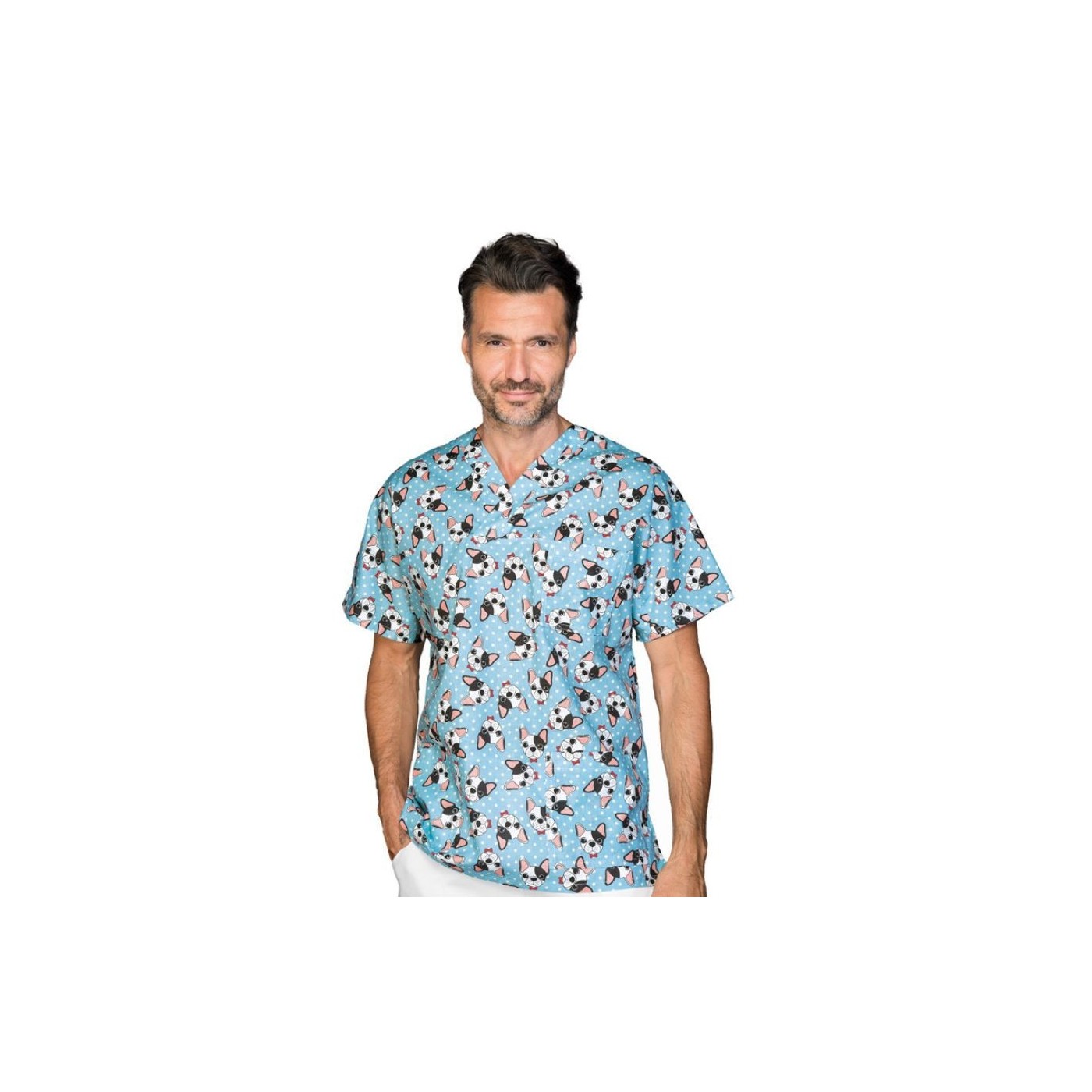The Blue Dog Veterinary Coat is unisex, 100% cotton and has a weight of 115 g/m². It has three pockets and a crossed peak collar, ideal for professionals in the veterinary sector.