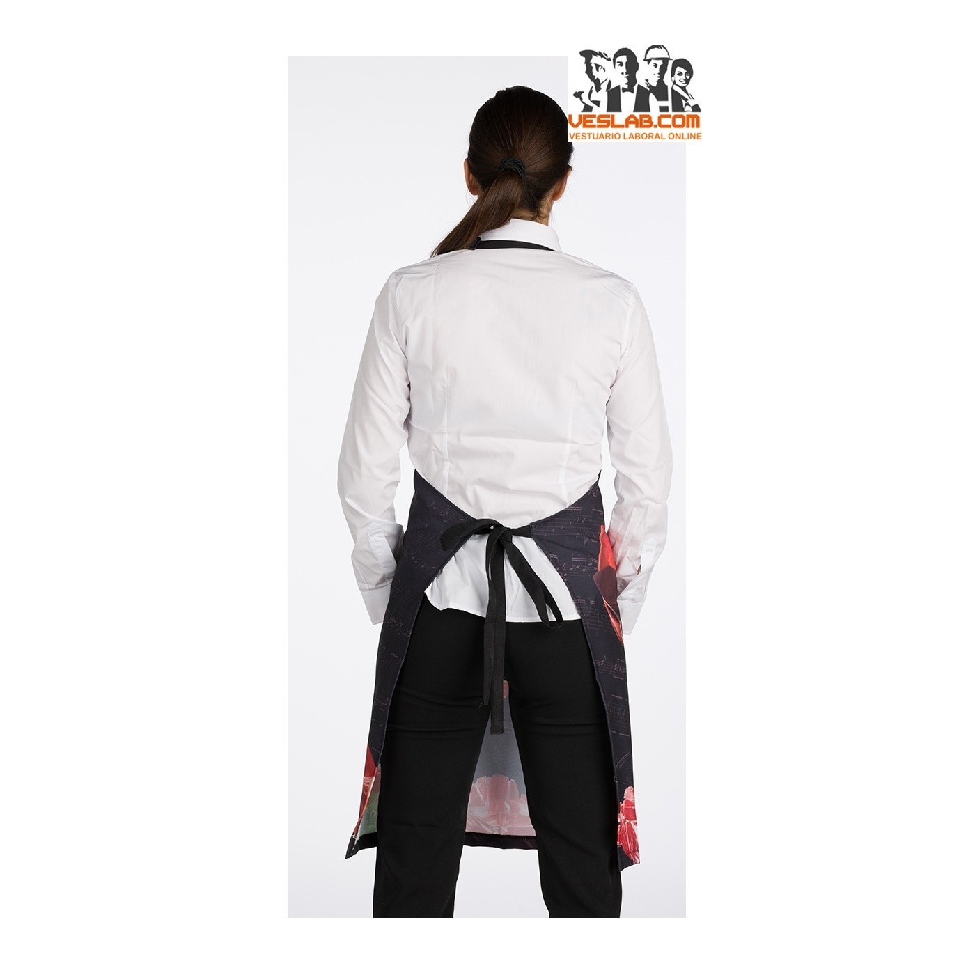 Medium print apron with draped bib and pocket, adjustable neck strap with buckle. It fits with ribbons that are knotted in the back.