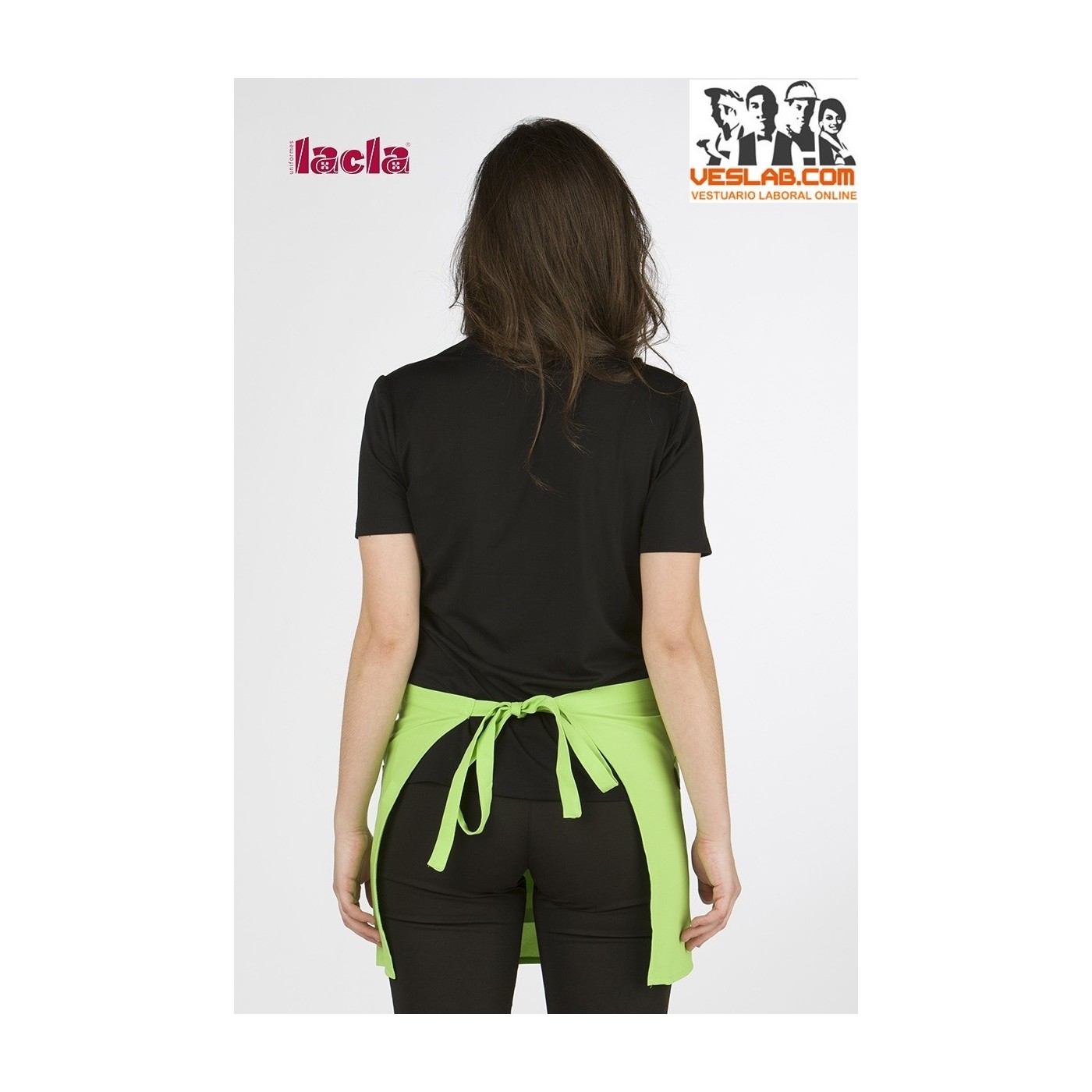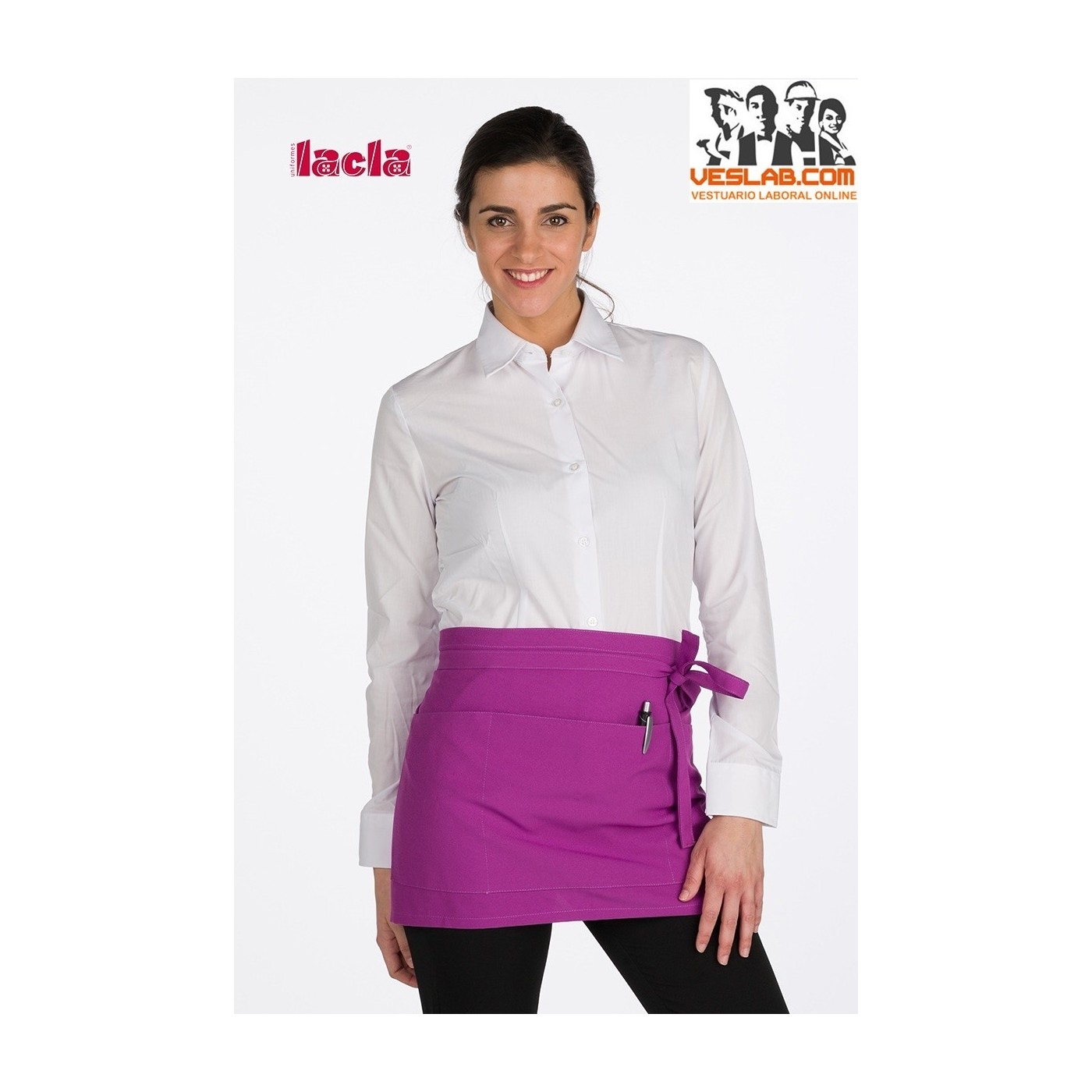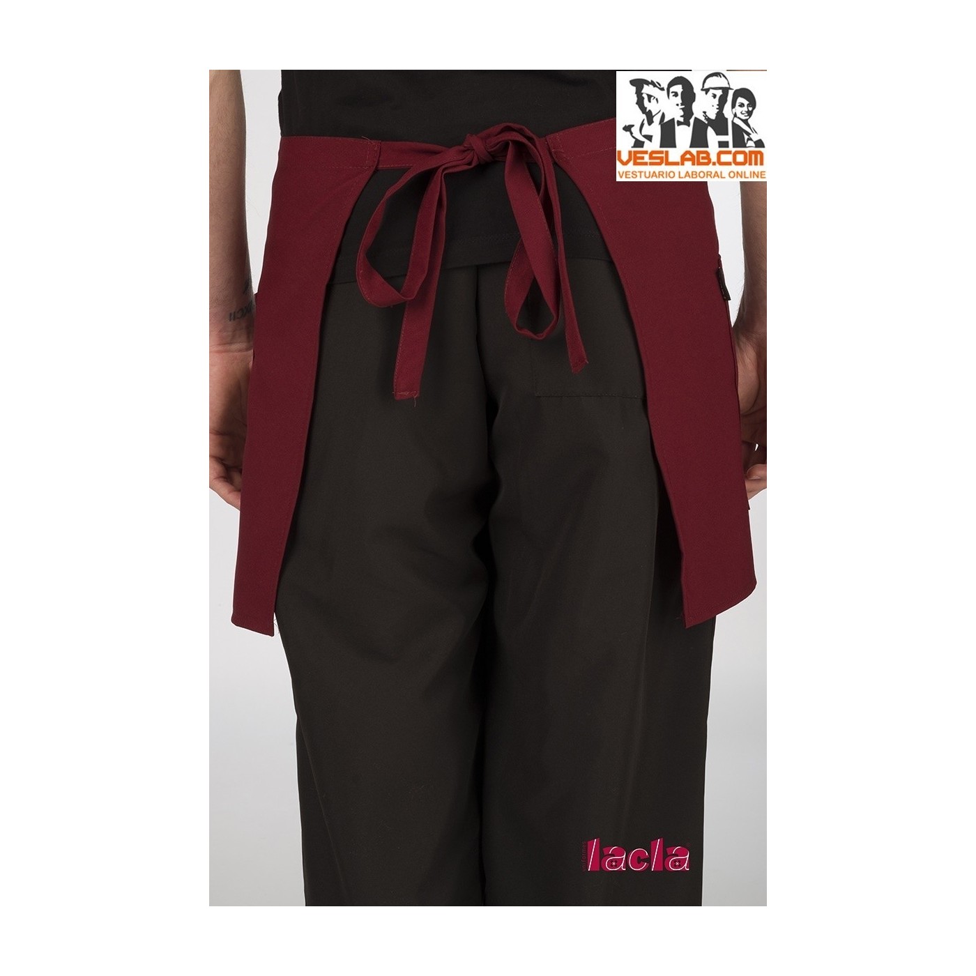 Long apron with pocket. wide waistband with waist adjustment with ribbons that cross at the back and knot in front. Front center with lower opening.