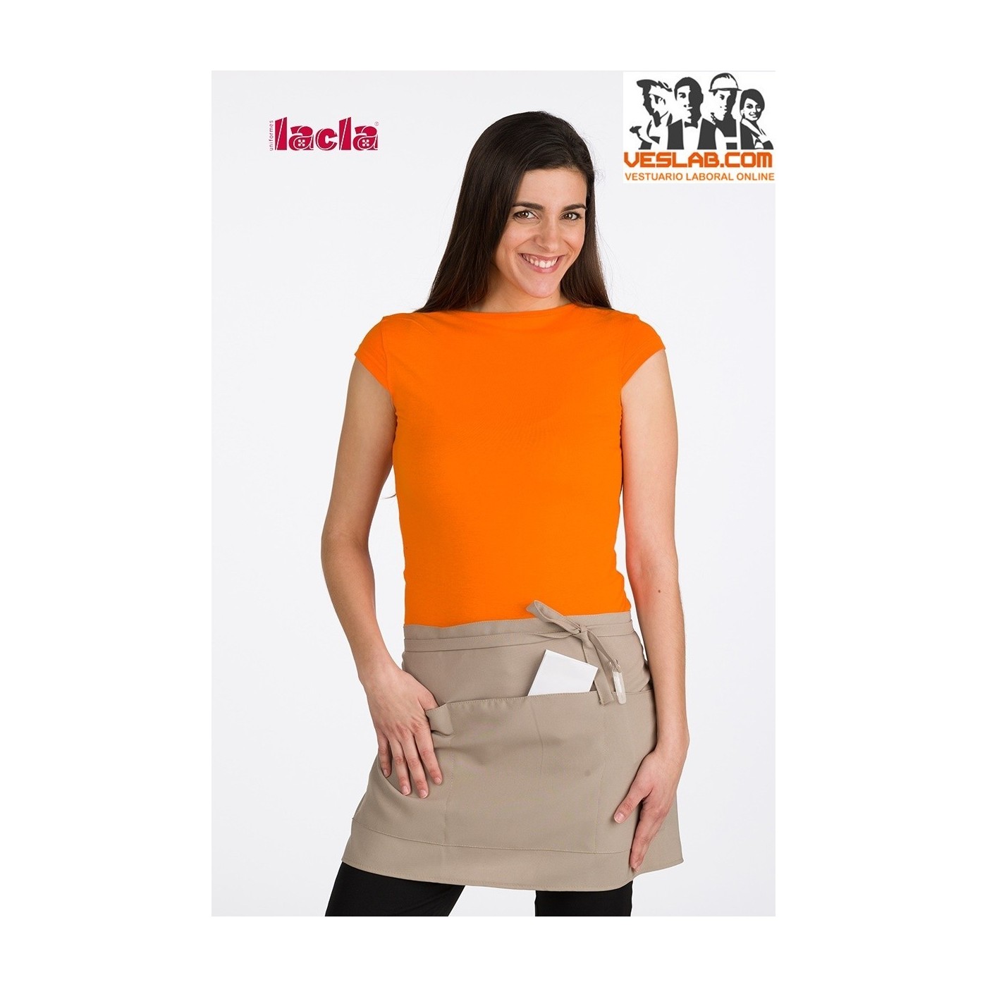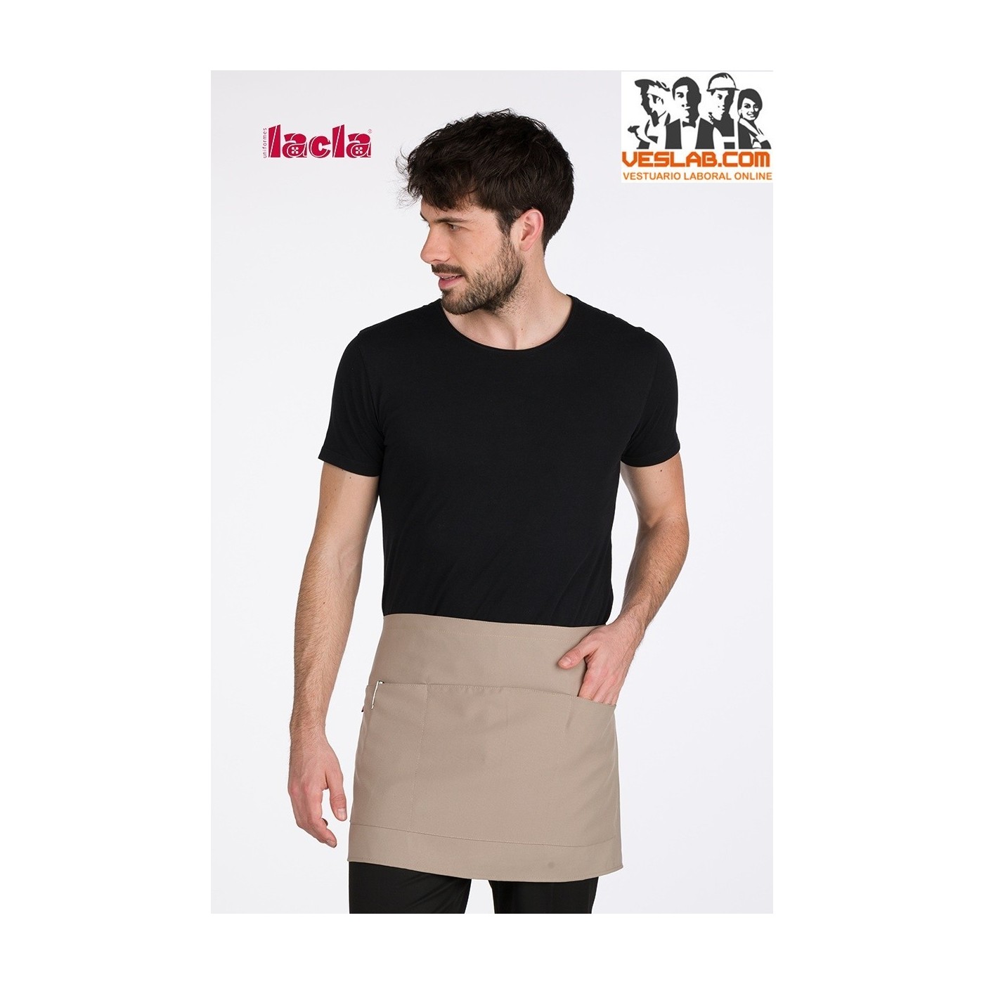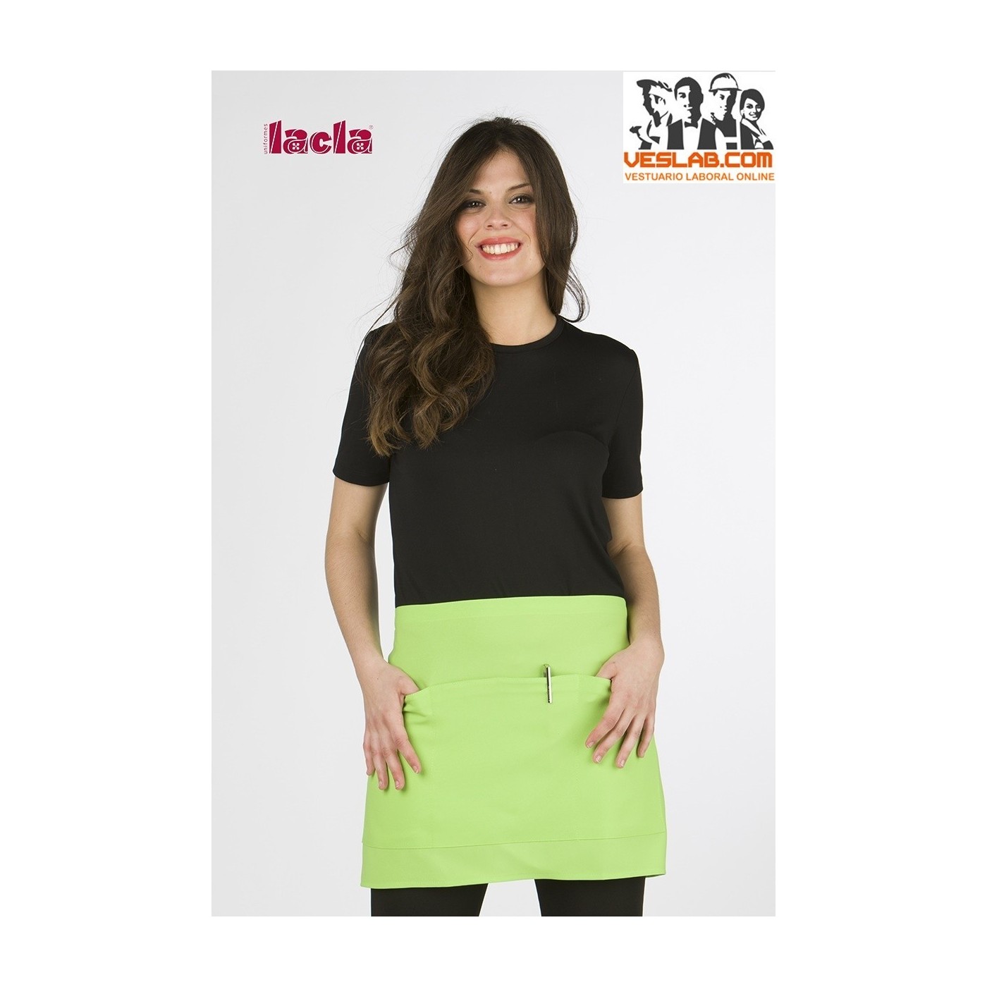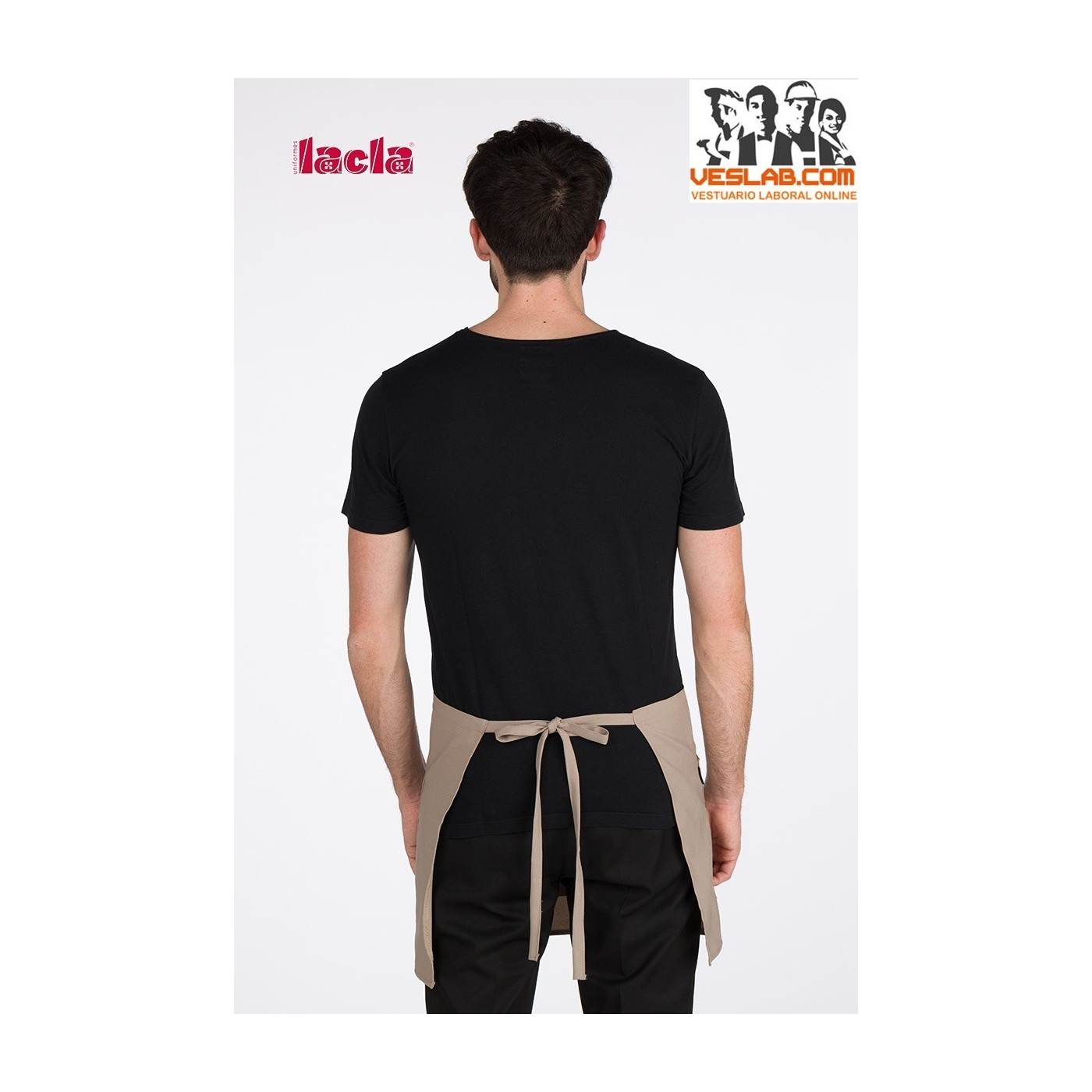 Long apron with pocket. wide waistband with waist adjustment with ribbons that cross at the back and knot in front. Front center with lower opening.