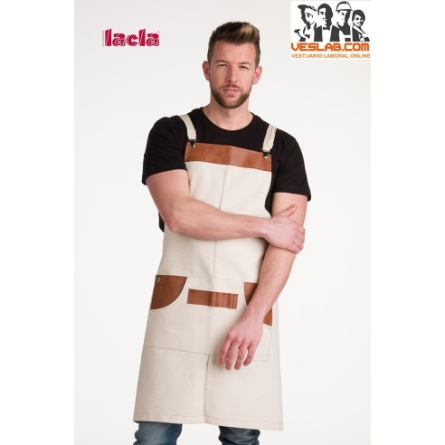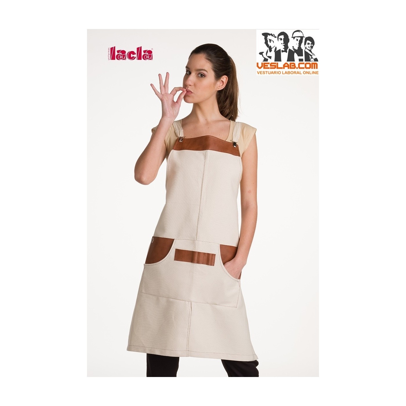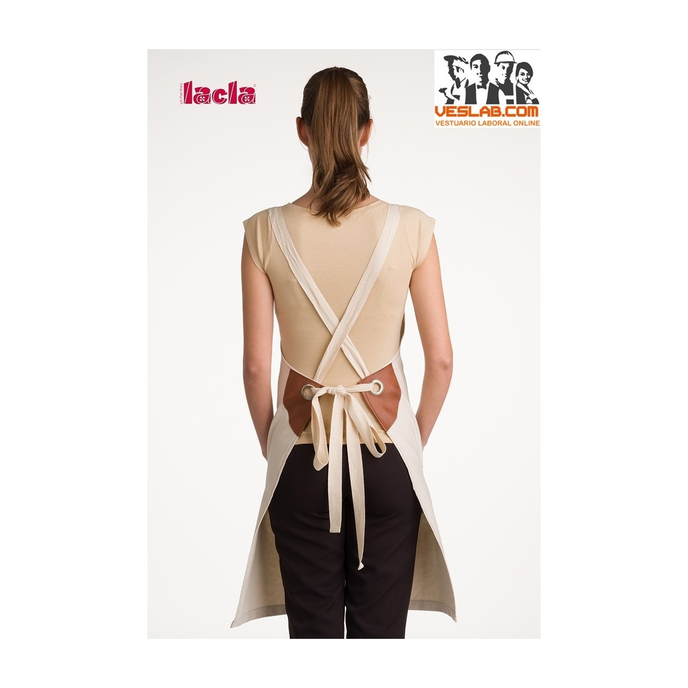 Medium print apron with draped bib and pocket, adjustable neck strap with buckle. It fits with ribbons that are knotted in the back.