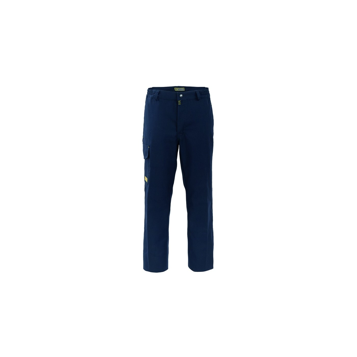Zip flap closure with snap button, elasticated on the sides, 2 front pockets on the inside, 1 back pocket on the right with flap and velcro closure, 1 closed side pocket with flap and velcro applied on the right leg, several seams yellow in contrast, jacquard label with pictograms stitched in a pocket.