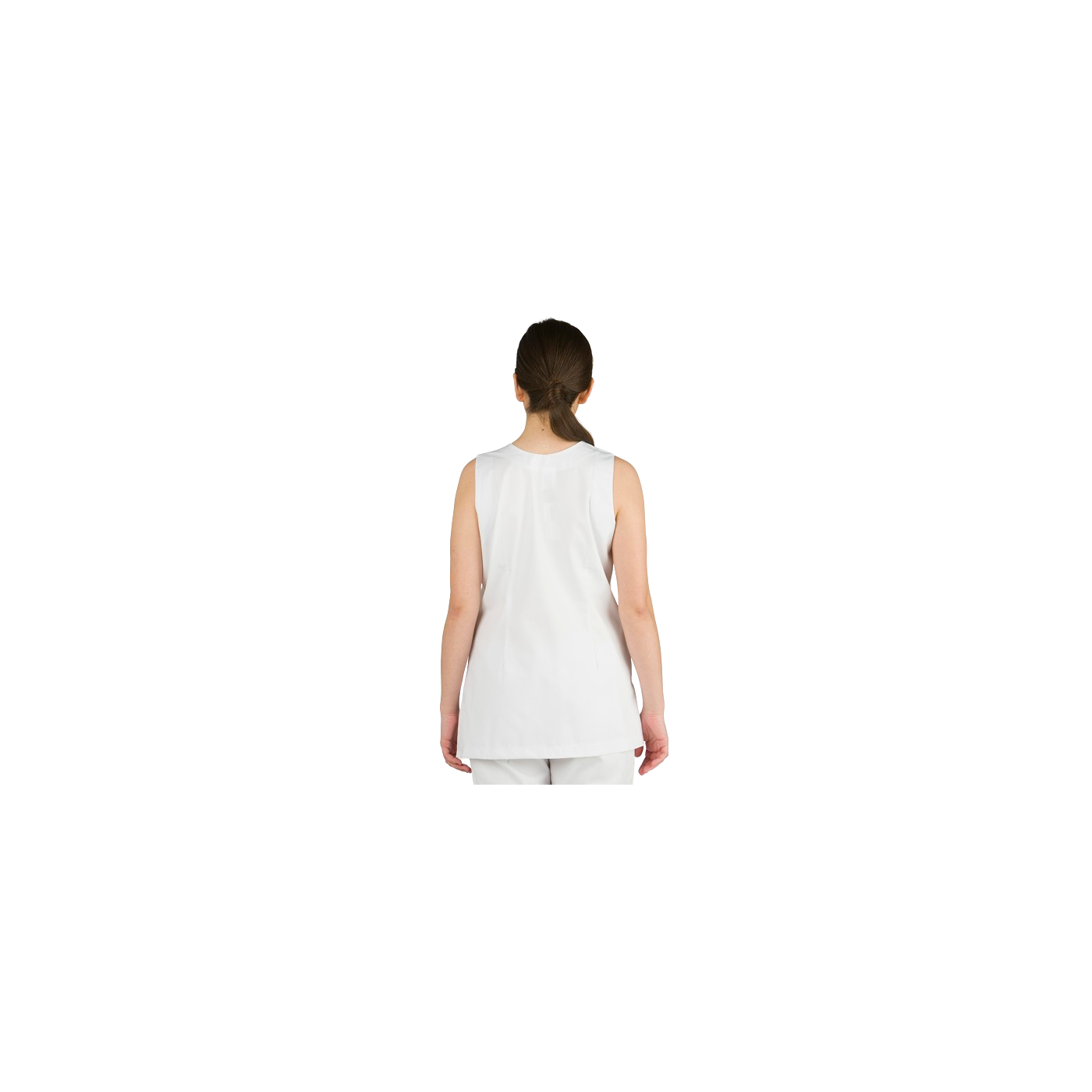 Smooth jacket, with front sides and pockets with colorful embellishment, with central zip, neckline in the shape of a peak, back with tweezers and round side openings in the front.