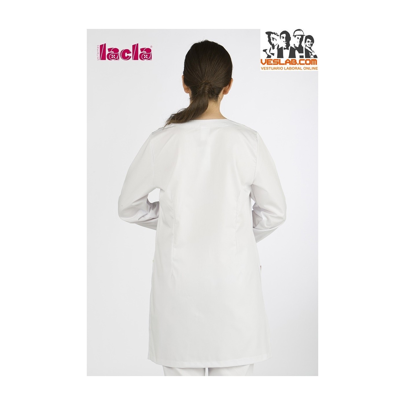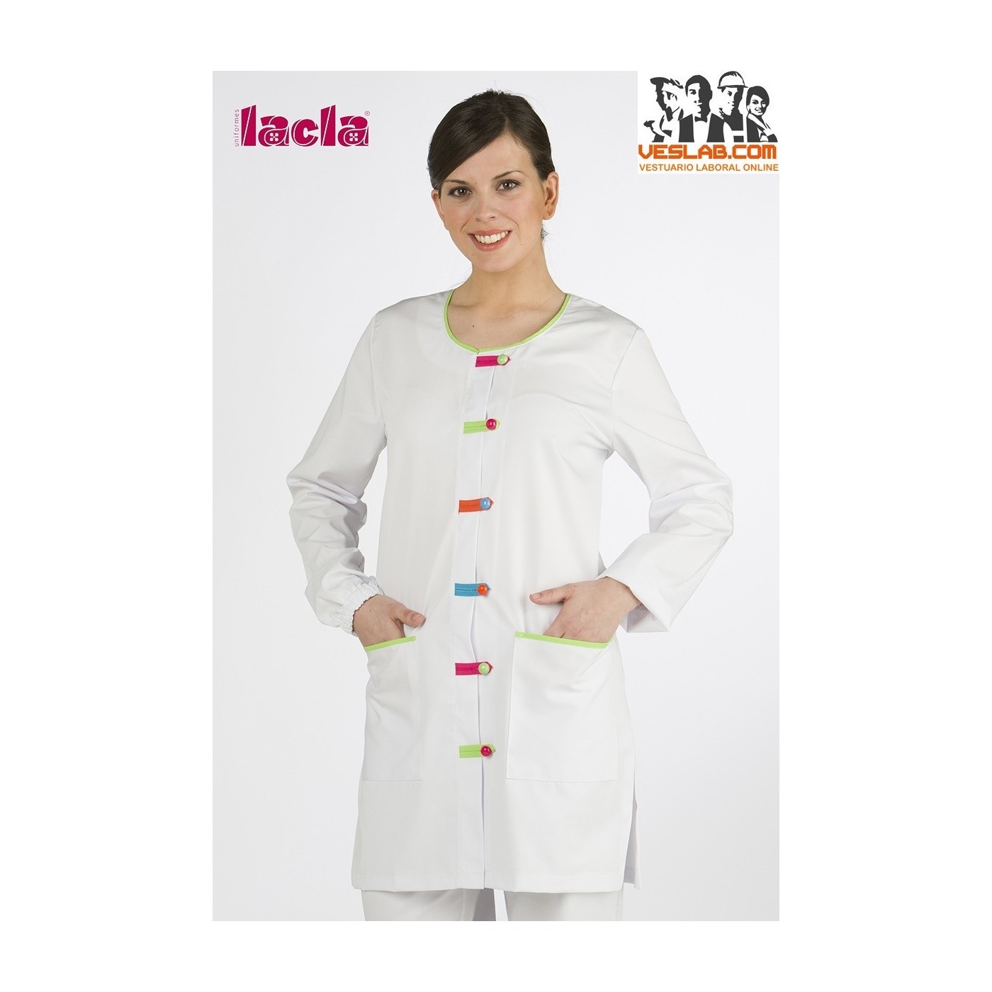 Smooth robe, long sleeves with rubber cuffs, front with placket tabllets and colored buttons, round neckline and pockets with bias color contrast, side openings. Back with back clamps. COMPOSITION: 67% POLYESTER-33% COTTON