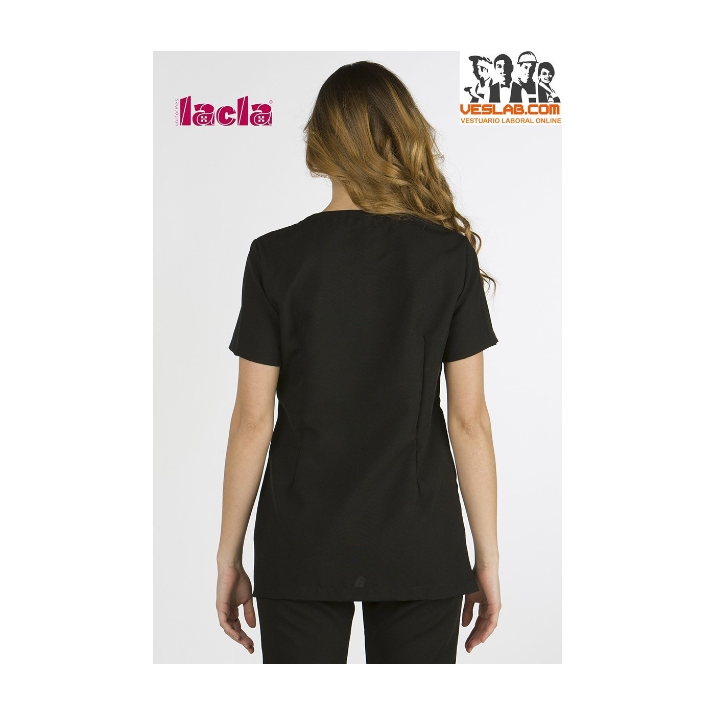 Smooth jacket with front selvedges, central zipper, round neckline in the shape of a peak, with pockets, back with clips, short sleeves.