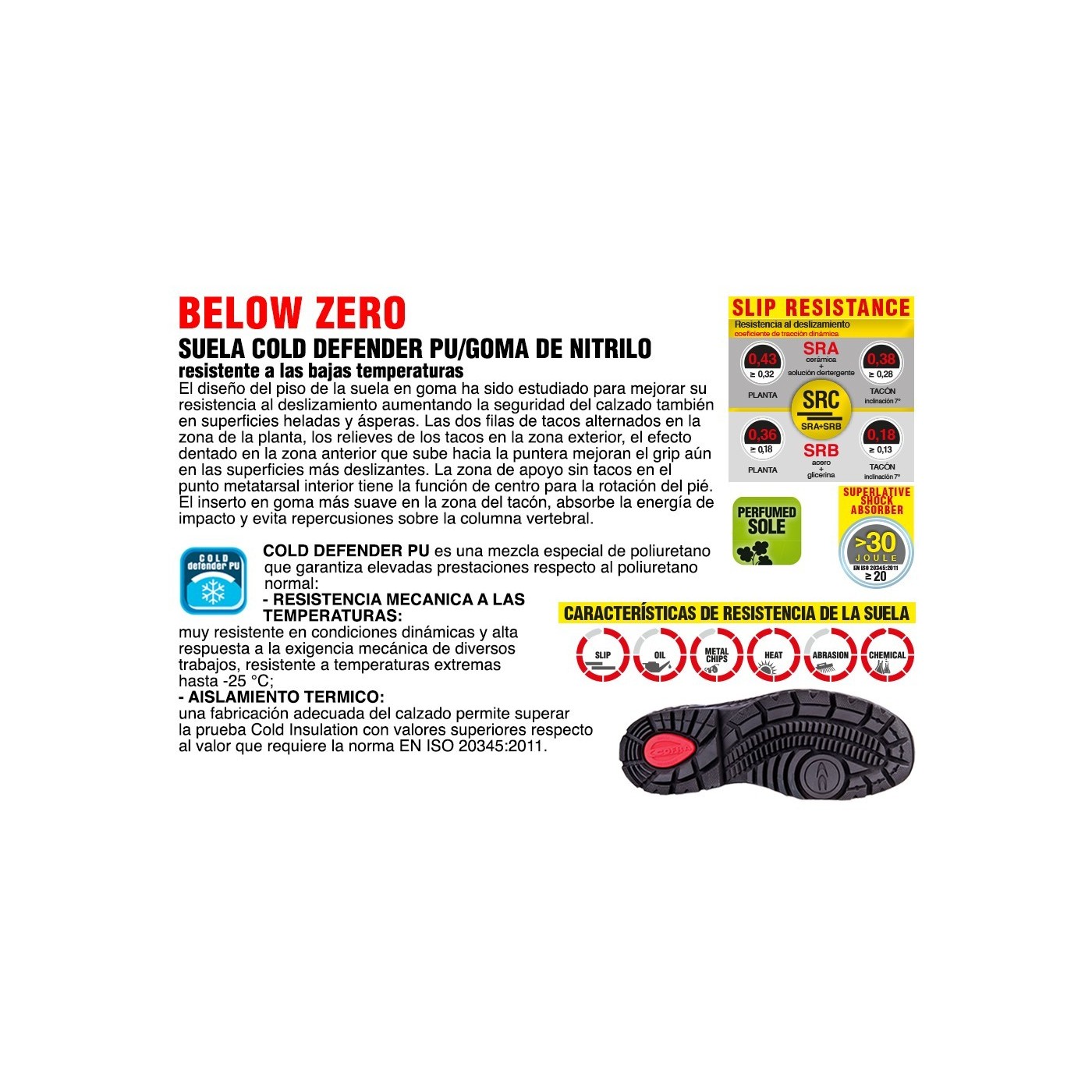 Sole: COLD DEFENDER PU/nitrile rubber, heat-resistant up to +300 °C (1 minute contact) and cold-resistant down to -25 °C. Its design enhances grip on icy surfaces and reduces spinal impact.