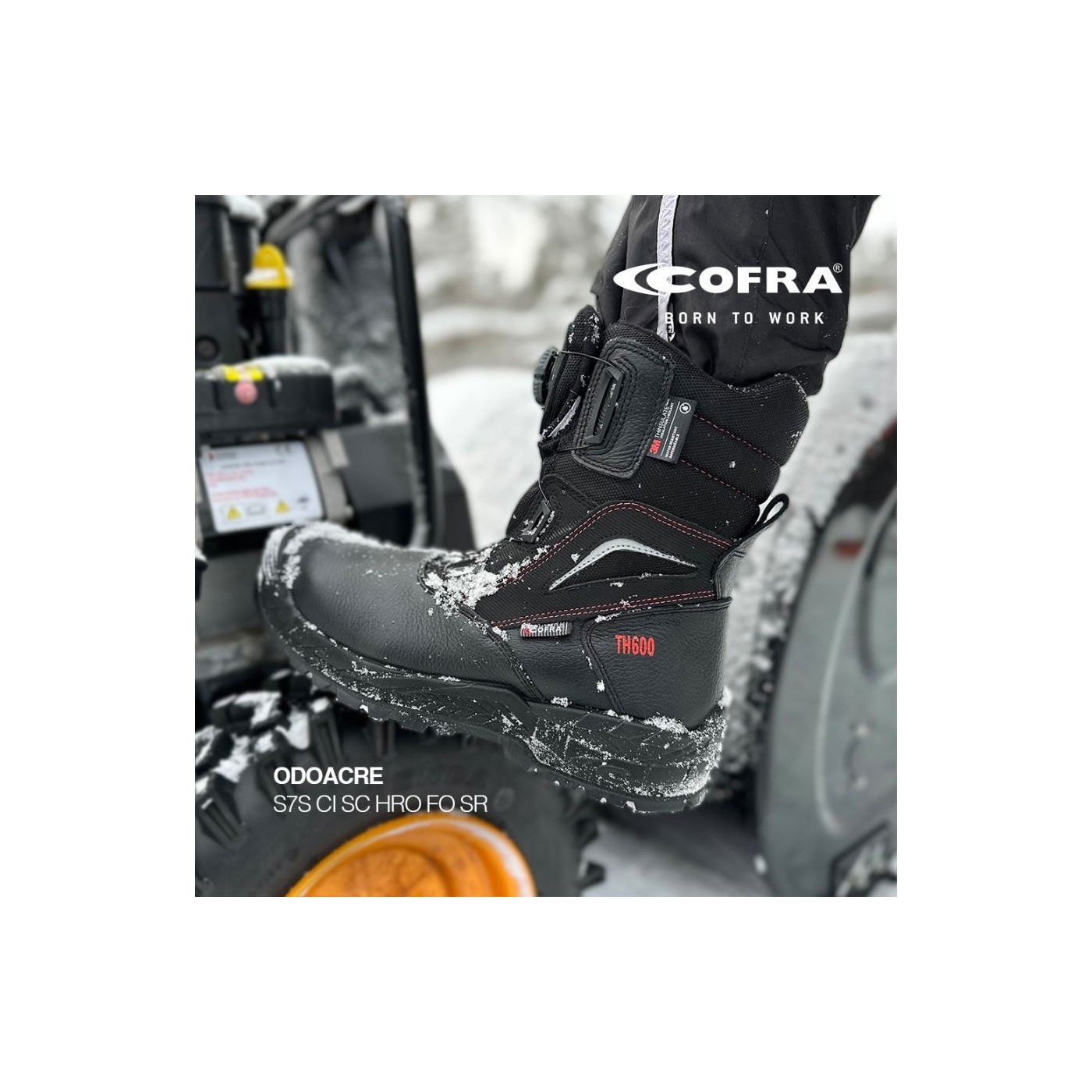 The Cofra ODOACRE S3 WR CI HRO SRC safety boot offers maximum protection in extremely cold environments. Its water-repellent upper, WIN THERM® lining with Thinsulate™ 600g, and COLD DEFENDER PU sole ensure thermal insulation down to -25 °C and excellent water resistance and slip resistance. Ideal for work in extreme conditions.