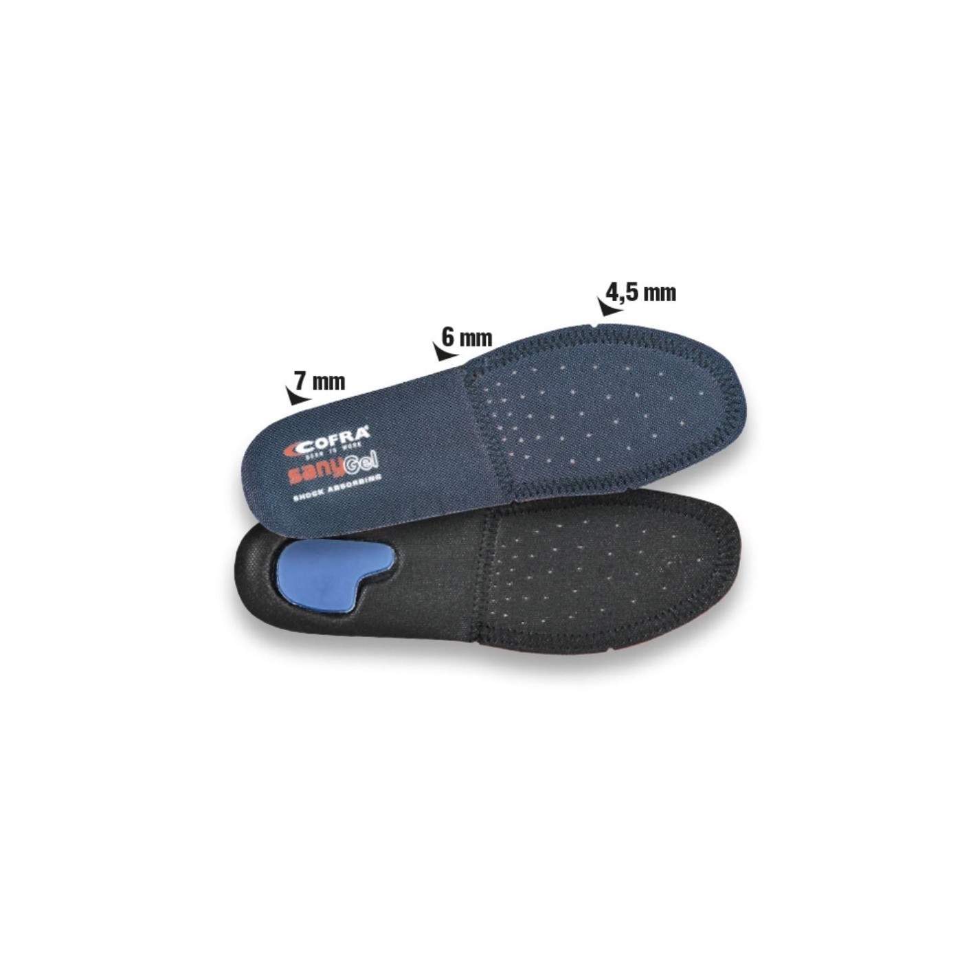 Cofra Sany-Gel insole anatomic, perforated, antistatic thanks to a seam made with conductive threads, with gel under the heel; its lining in contact with the skin absorbs sweat from the entire sole and enhances breathability.