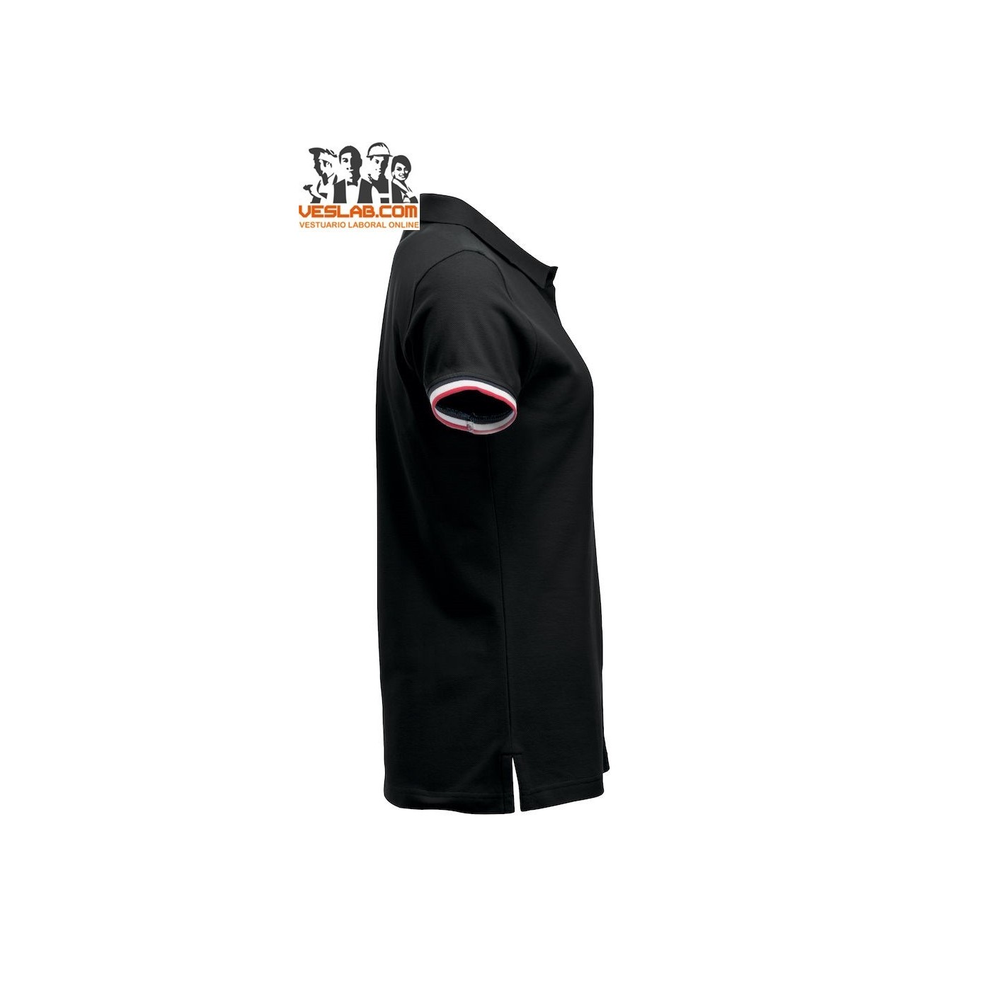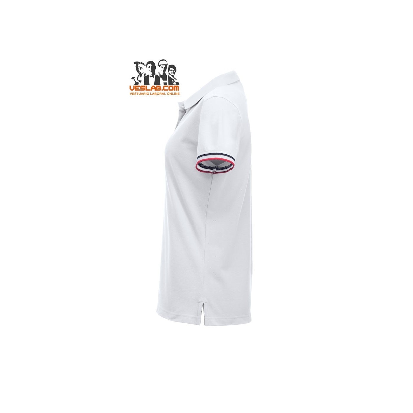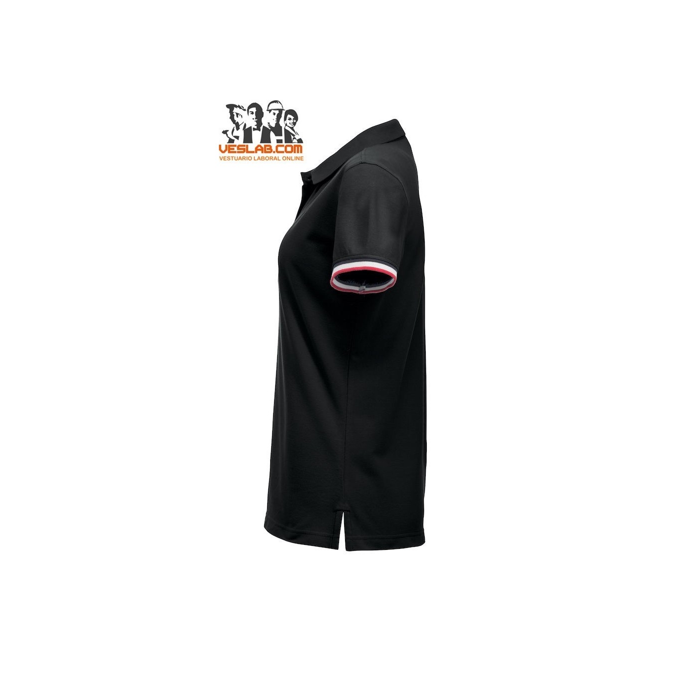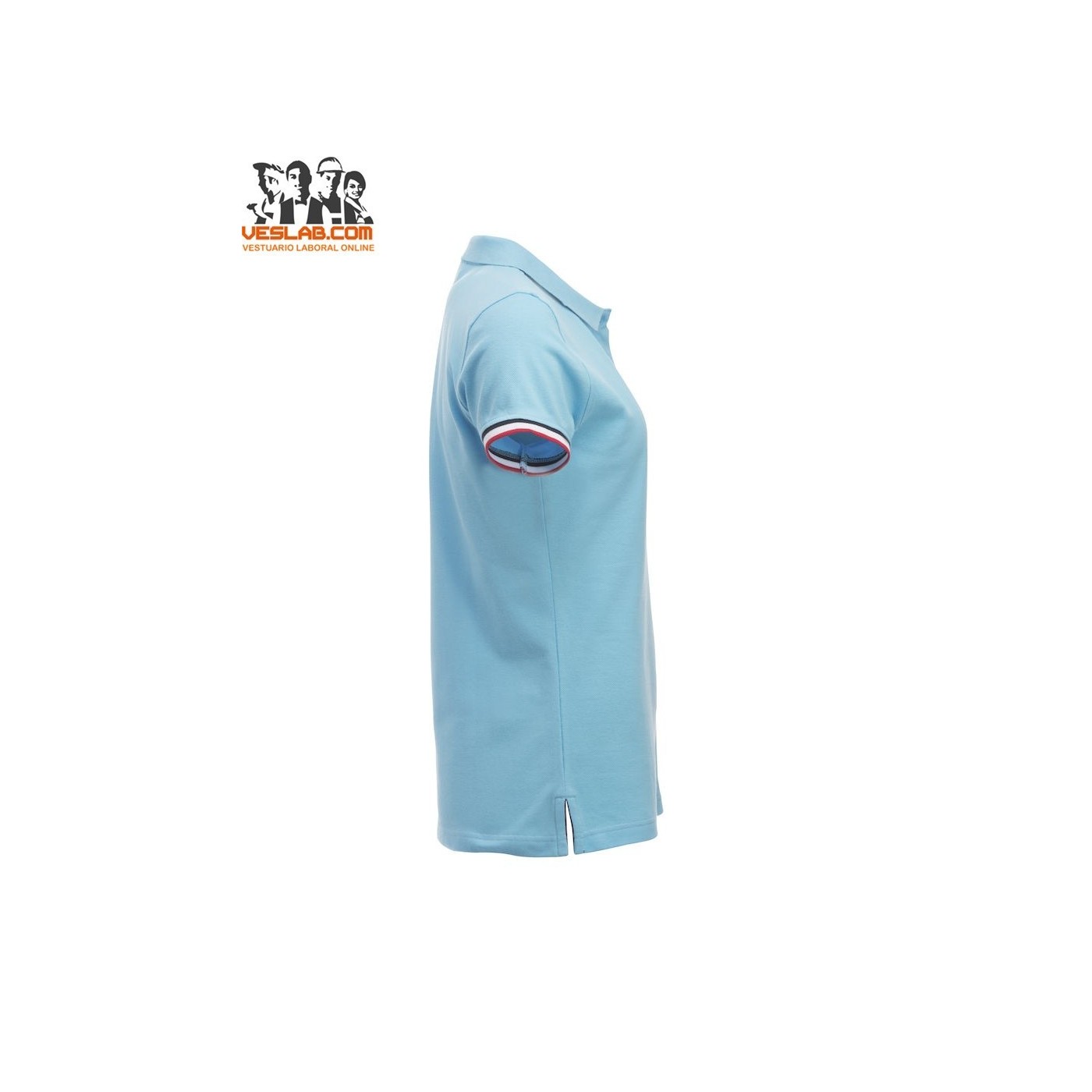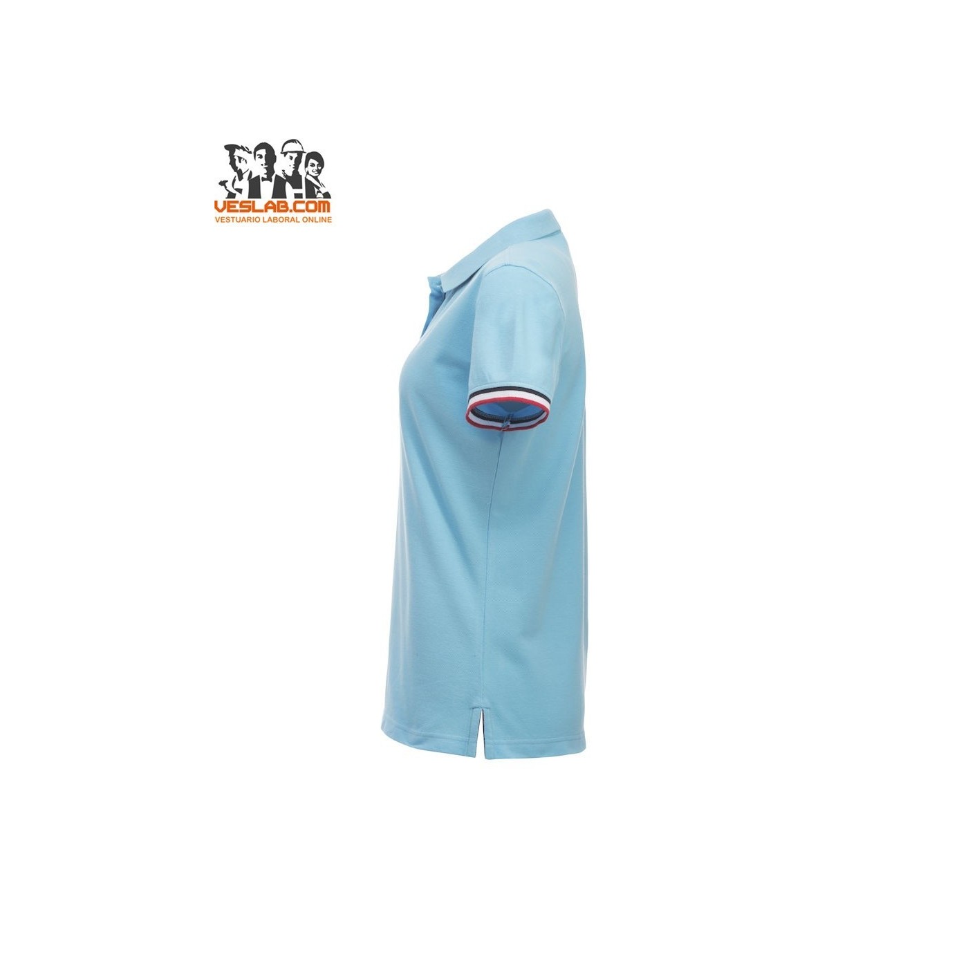 Cotton polo shirt with contrast to three colors on the back of the collar, placket, sleeve and side openings.