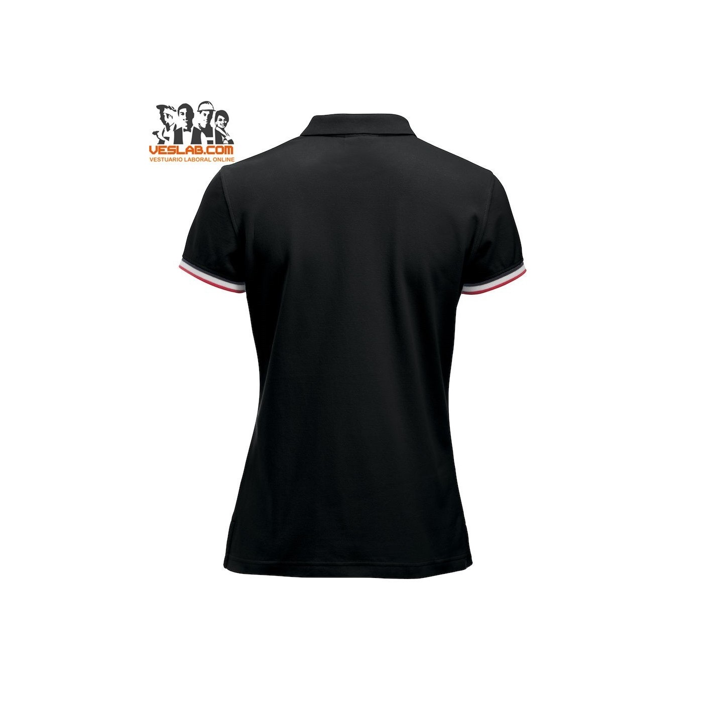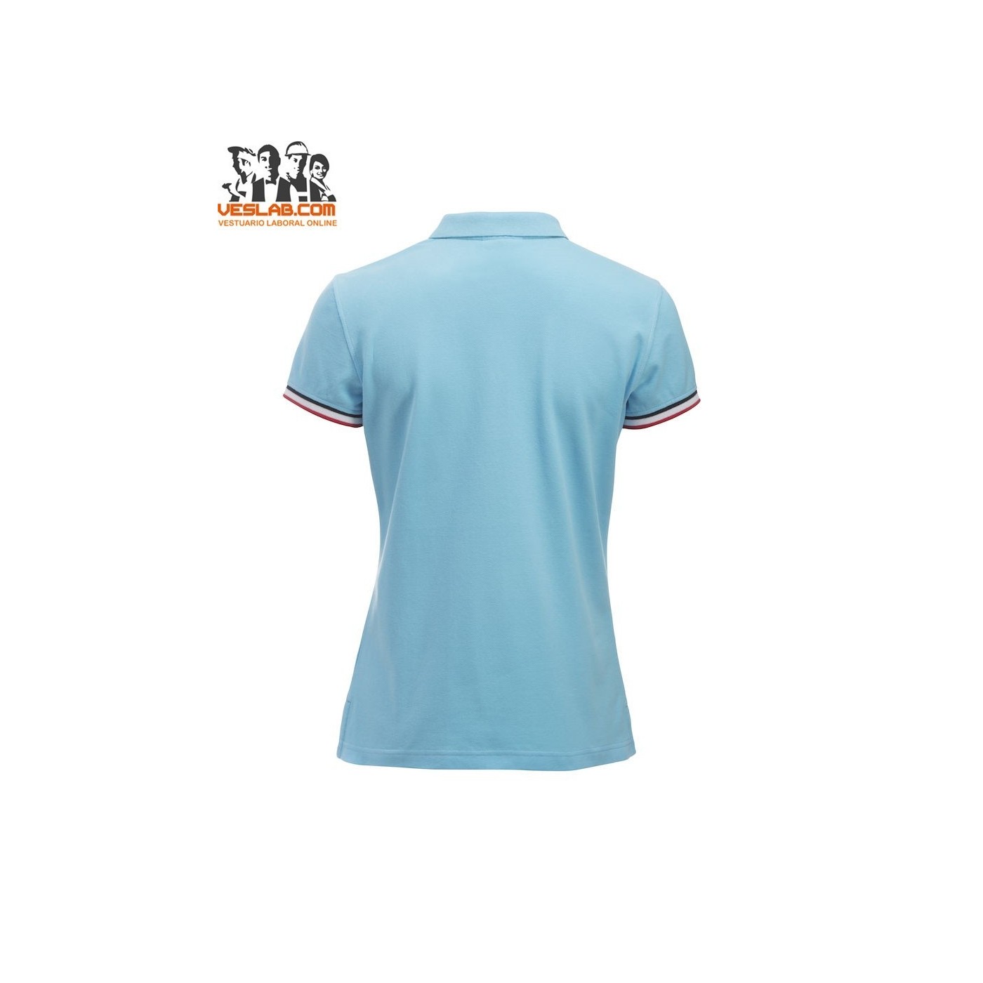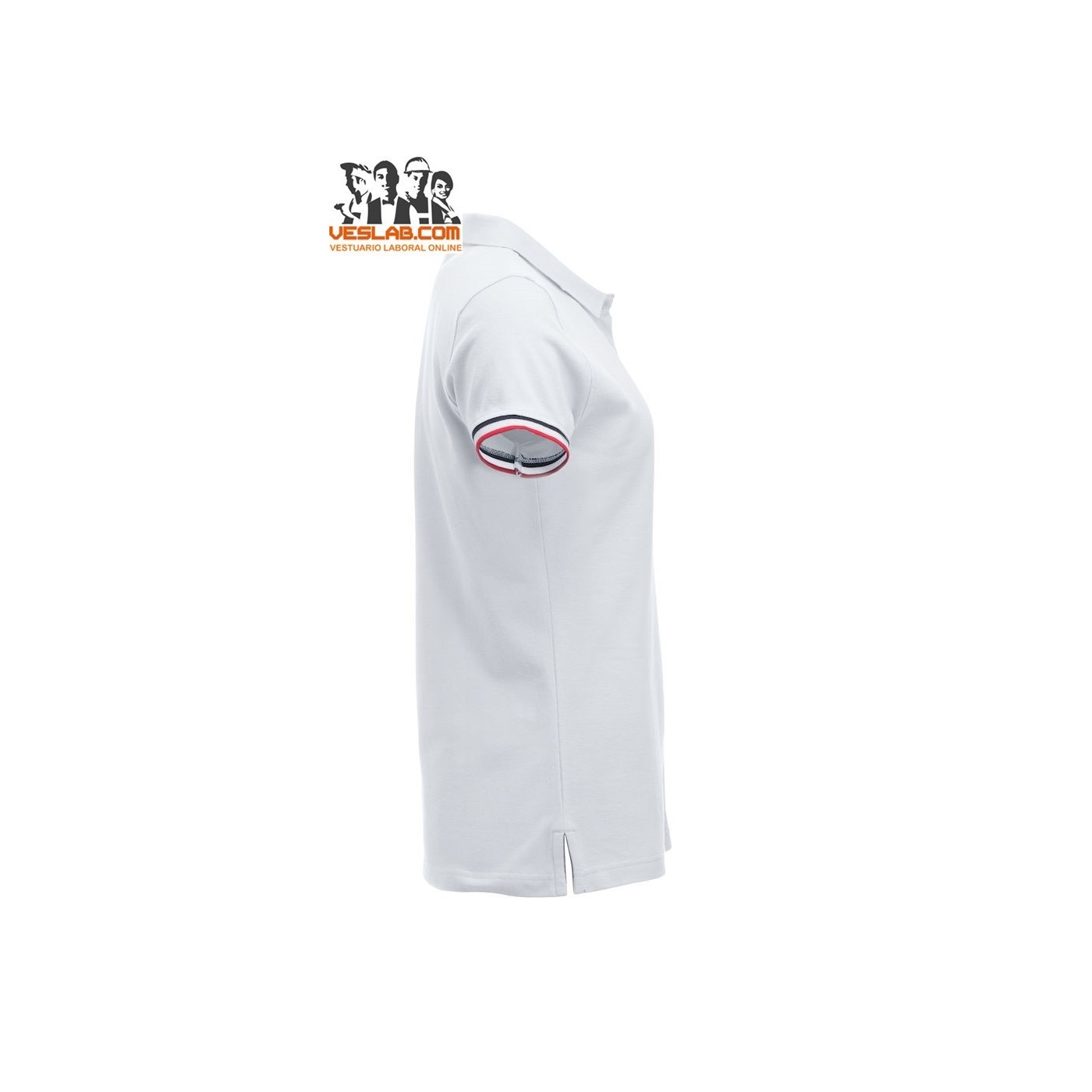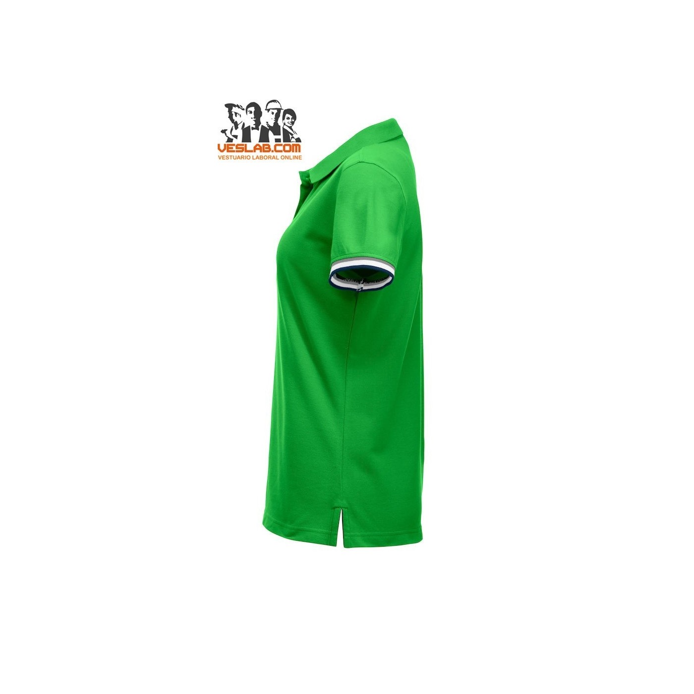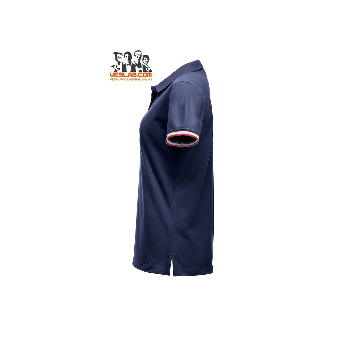 Cotton polo shirt with contrast to three colors on the back of the collar, placket, sleeve and side openings.